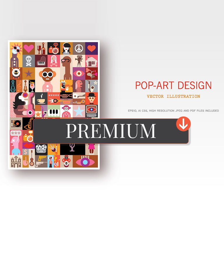 Pop Art Design Vector Illustration - Abstract collage with people portraits, musical instruments, and many different images.